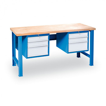 dílenský stůl s 2 pevnými nohami, 2x 3 zásuvkový kontejner, rozměry 1700x685x840 mm