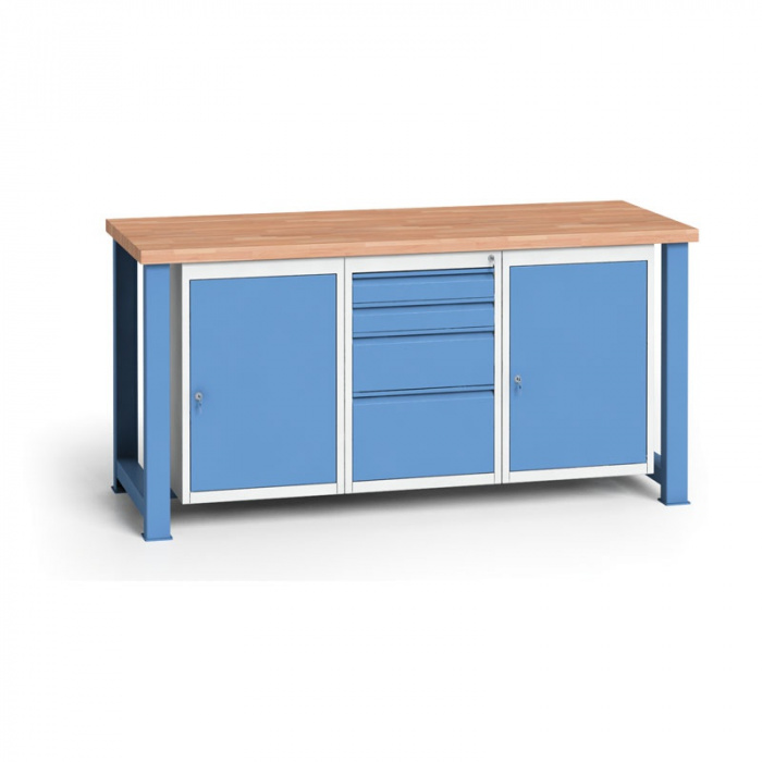 Dílenský stůl DST, pevné podnoží, buková spárovka, 1700 x 685 mm, kontejner AADPracovní deska stolů je vyrobena z masívní spárovky z tvrdého dřeva o tloušťce 40 mm. Vyšší váha desky spolu s pevným a stabilním podnožím zaručuje velmi dobrou stabilitu stolu, která vyhovuje i těm nejnáročnějším druhům práce.