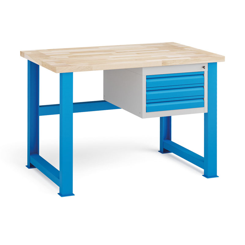 Dílenský stůl DST, pevné podnoží, buková spárovka, 1700 x 685 mm, kontejner HPracovní deska stolů je vyrobena z masívní spárovky z tvrdého dřeva o tloušťce 40 mm. Vyšší váha desky spolu s pevným a stabilním podnožím zaručuje velmi dobrou stabilitu stolu, která vyhovuje i těm nejnáročnějším druhům práce. Nohy stolů jsou svařeny z ocelových profilů tloušťky 3 mm a lakovány práškovaným lakem RAL 5012. Stoly jsou vyráběny ve třech délkách: 1200, 1700 a 2100 mm.