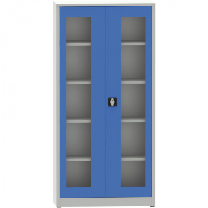 Domů Kancelářský nábytek Kancelářské skříně Kovová skříň s prosklenými dveřmi 1950x 950x500 mm, šedá/modrá, 4 police/65 kg, svař.