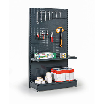Prodejní regál oboustranný, perfo stěny, 2200 x 1000 x 900 mm, základní, antracitPro sestavení prodejních regálů si vyberte potřebný počet základních a přídavných rámových konstrukcí (dodávají se vč. spodní výplňové police) a k nim vyberte police podle potřeby v hloubkách 400 nebo 450 mm.