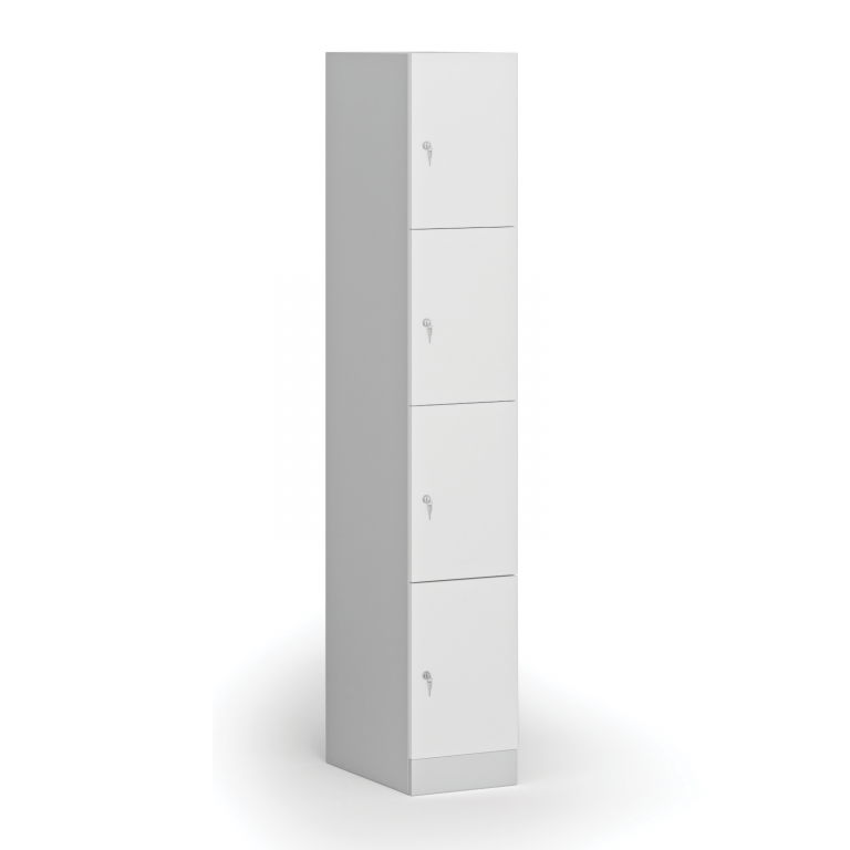 Šatní skříňka s úložnými boxy, 4 boxy, 1850 x 300 x 500 mm, cylindrický zámek, laminované dveře, bílá| Hmotnost (kg) | 28 |