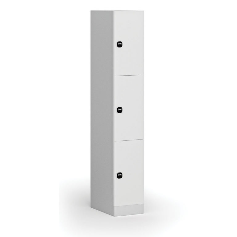 Šatní skříňka S1 s úložnými boxy, 3 boxy, 1850 x 300 x 500 mm, RFID zámek, laminované dveře, bílá| Hmotnost (kg) | 28 |