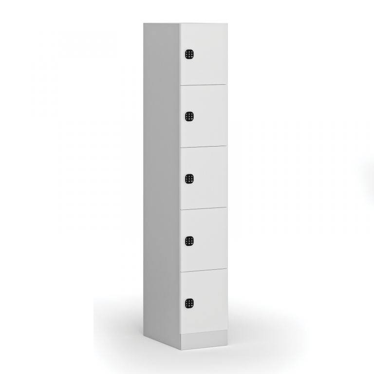 Šatní skříňka S1 s úložnými boxy, 5 boxů, 1850 x 300 x 500 mm, kódový zámek, laminované dveře, bílá| Hmotnost (kg) | 31 |