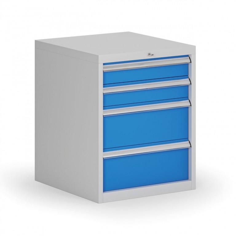 Závěsný dílenský box ke stolu G8, 4 zásuvky, 560 x 600 x 700 mm, modráZávěsné kontejnery k dílenským stolům představují praktické a bezpečné úložné řešení pro nářadí, spotřební materiál i dokumentaci. Jsou vyrobeny z robustního ocelového plechu, vybaveny kuličkovými výsuvy s nosností zásuvek až 40 kg a opatřeny centrálním zámkem pro současné uzamčení všech zásuvek. Kvalitní práškový lak chrání povrch před poškrábáním a korozí, hliníková madla zajišťují pohodlné otevírání i při každodenním používání. Díky univerzální konstrukci je lze snadno zavěsit pod většinu typů dílenských stolů.