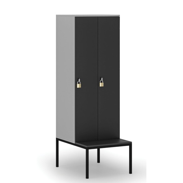 Dřevěná šatní skříňka s lavičkou, 2 oddíly, otočný zámek, šedá/grafitDřevěná šatní skříň s lavičkou pochází z naší vlastní produkce. Zaměřili jsme se především na funkčnost a bezpečnost. Rohy jsou olepeny ABS plastovou hranou. Skříni nechybí ventilace, která je zajištěna otvory v zadní stěně.