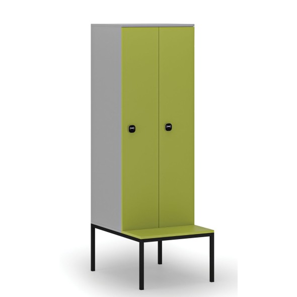 Dřevěná šatní skříňka s lavičkou, 2 oddíly, RFID zámek, šedá/zelenáDřevěná šatní skříň s lavičkou pochází z naší vlastní produkce. Zaměřili jsme se především na funkčnost a bezpečnost. Rohy jsou olepeny ABS plastovou hranou. Skříni nechybí ventilace, která je zajištěna otvory v zadní stěně.