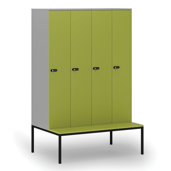 Dřevěná šatní skříňka s lavičkou, 4 oddíly, mechanický kódový zámek, šedá/zelenáDřevěná šatní skříň s lavičkou pochází z naší vlastní produkce. Zaměřili jsme se především na funkčnost a bezpečnost. Rohy jsou olepeny ABS plastovou hranou. Skříni nechybí ventilace, která je zajištěna otvory v zadní stěně.