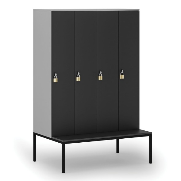 Dřevěná šatní skříňka s lavičkou, 4 oddíly, otočný zámek, šedá/grafitDřevěná šatní skříň s lavičkou pochází z naší vlastní produkce. Zaměřili jsme se především na funkčnost a bezpečnost. Rohy jsou olepeny ABS plastovou hranou. Skříni nechybí ventilace, která je zajištěna otvory v zadní stěně.