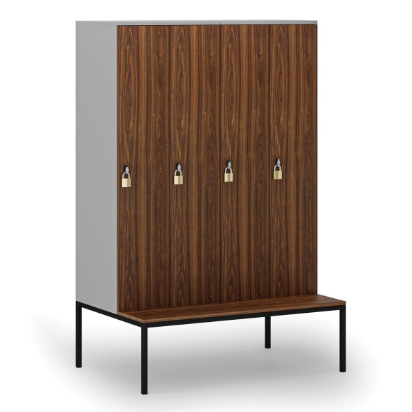 Dřevěná šatní skříňka s lavičkou, 4 oddíly, otočný zámek, šedá/ořechDřevěná šatní skříň s lavičkou pochází z naší vlastní produkce. Zaměřili jsme se především na funkčnost a bezpečnost. Rohy jsou olepeny ABS plastovou hranou. Skříni nechybí ventilace, která je zajištěna otvory v zadní stěně.